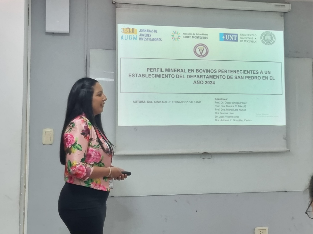 En representación de la Facultad de Ciencias Veterinarias de la UNA, participa la estudiante Tania Maluf Fernández Galeano, de la Sede San Lorenzo, quien presentó el trabajo titulado “Perfil mineral en bovinos pertenecientes a un establecimiento del Departamento de San Pedro en el año 2024”.