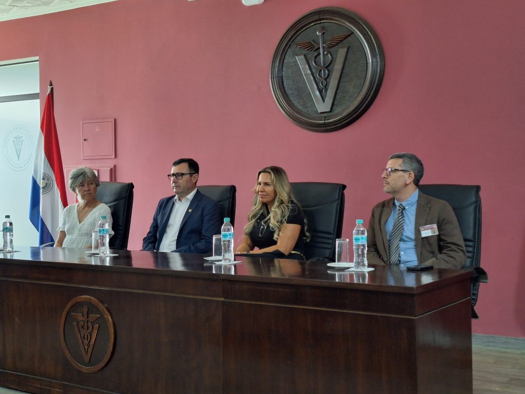 La mesa de honor estuvo integrada por la Prof. Dra. Viviana Ríos Morínigo, decana de la FCV UNA; el Prof. Dr. Roger González Vatteone, director de Postgrado de la FCV UNA; y la Prof. Mgtr. Elena Murdoch, representante legal de la Fundación Equinoterapia y coordinadora del diplomado. La actividad contó además con la presencia de autoridades académicas, docentes, estudiantes e invitados especiales.