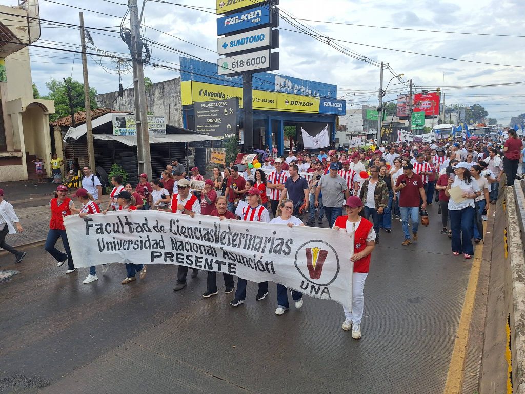 Docentes de la Facultad de Ciencias Veterinarias de la UNA participaron este viernes 13 de febrero de la movilización desarrollada en el marco del paro total declarado por el Consejo Superior Universitario (CSU), medida que implica el cese de actividades en la Universidad Nacional de Asunción desde el 7 de febrero.