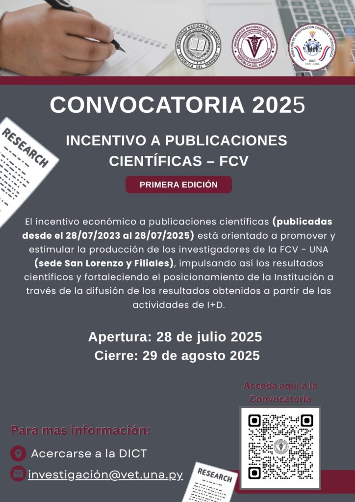 El incentivo económico a publicaciones científicas (publicadas desde el 28/07/2023 al 28/07/2025) está orientado a promover y estimular la producción de los investigadores de la FCV – UNA (sede San Lorenzo y Filiales), impulsando así los resultados científicos y fortaleciendo el posicionamiento de la Institución a través de la difusión de los resultados obtenidos a partir de las actividades de I+D.